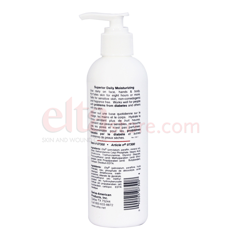Elta Lite lotion adds water to the skin, then uses the unique Elta Creme base to provide a watertight moisture barrier. This barrier substitutes for the skin's natural oil, delivering twice the long term moisturizing properties of other leading brands.