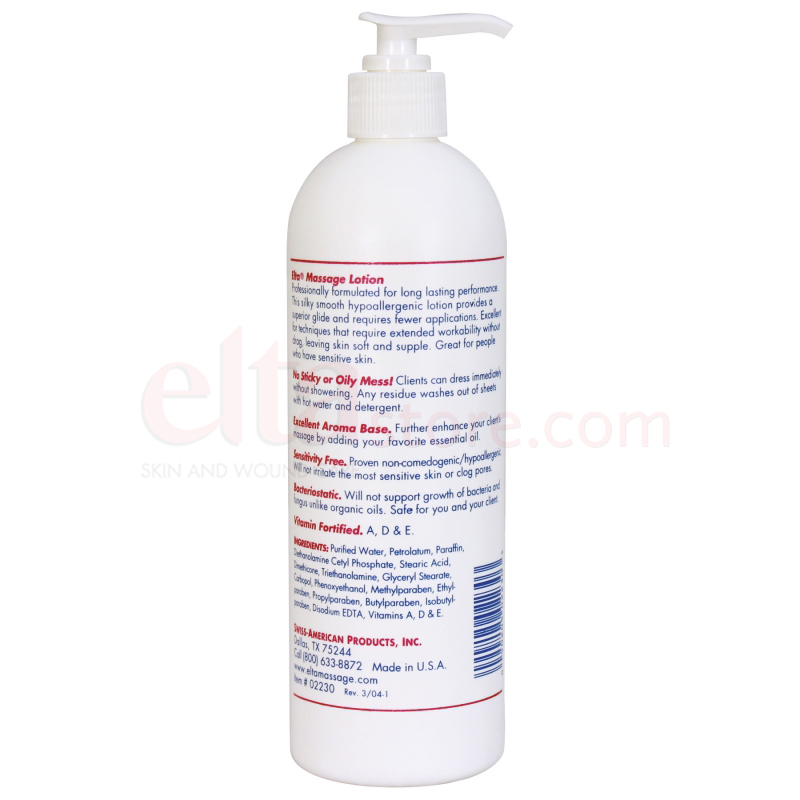 02230 Elta Massage Cream/Lotion - The silky smooth texture of this high quality, medical grade formula has been developed for the professional massage therapist. Excellent for deep tissue Swedish techniques and as a foot massage lotion. Moisturizes to improve skin quality during and after the massage.